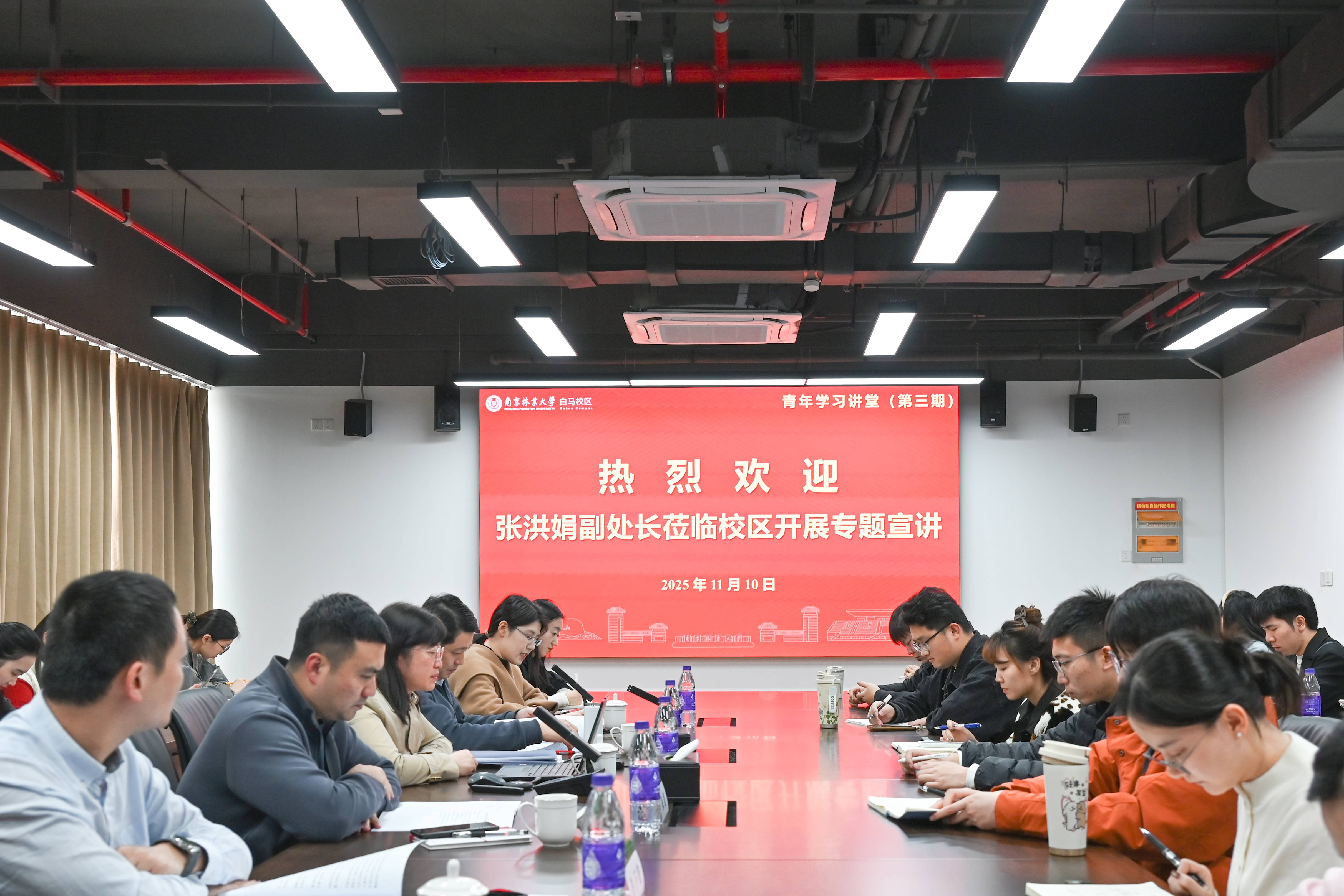 11月10日下午,由白马校区党委组织的第三期"青年学习讲堂"在第一会议室举办。本期讲座特邀校人事处副处长张洪娟教授作专题辅导报告。校区处科级干部、全体辅导员及管理岗位青年教职工参加学习。本期讲座由党政办公室主任陈汝雅主持。