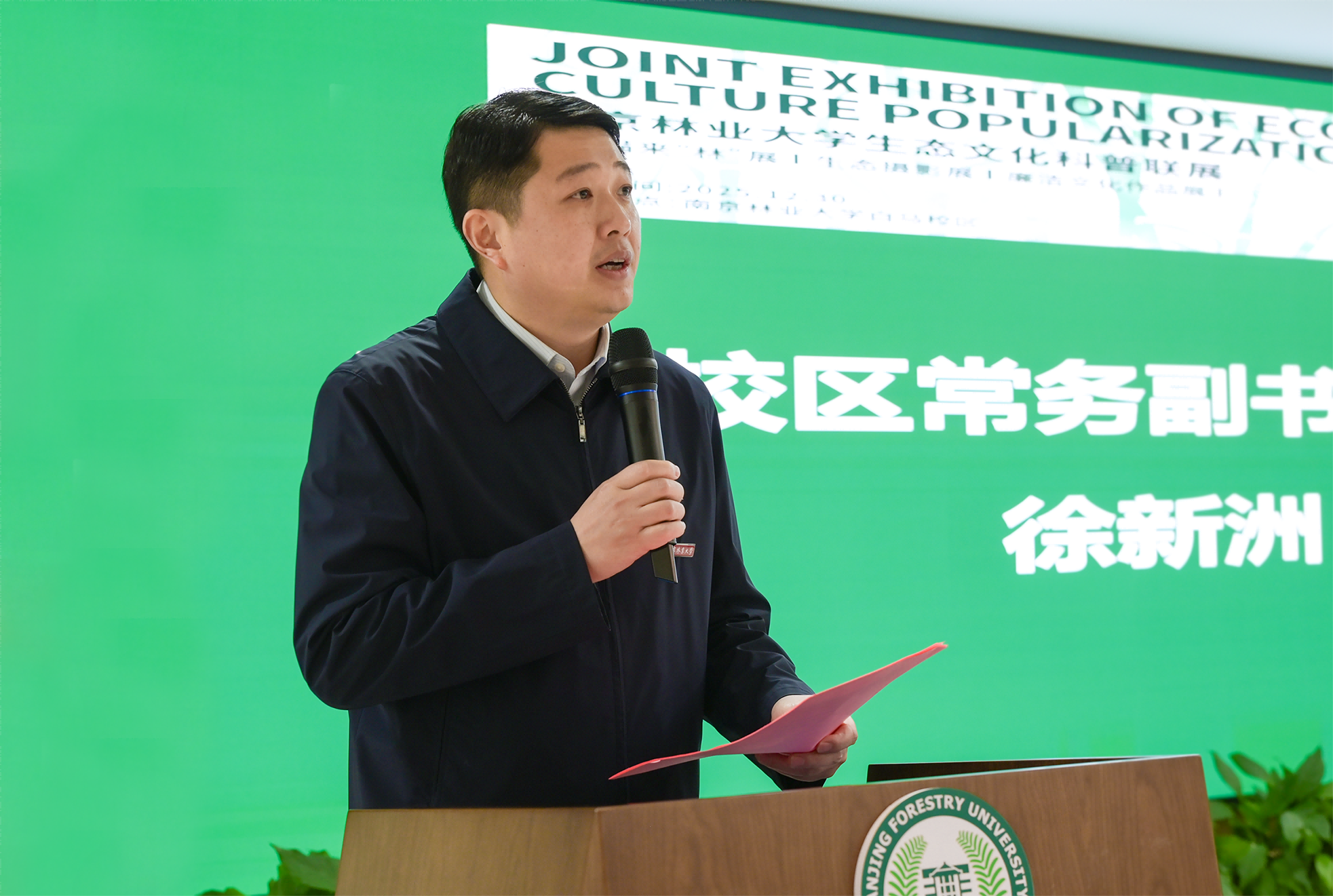 白马校区党委常务副书记、管委会常务副主任徐新洲在致辞中指出,白马校区自启用以来,始终深入践行“红绿相融”的校园文化理念,将绿色发展融入人才培养、校园建设和学生管理各环节,致力于培养具备生态文明素养的高素质人才。他表示,校区将以此联展为契机,依托溧水区和南京国家农高区区位优势,在生态科研协同创新、人才培养共建共享、文化科普互联互通等方面深化合作,共同打造校地融合发展的新典范,为溧水和南京的生态文明建设贡献更多“南林智慧”。