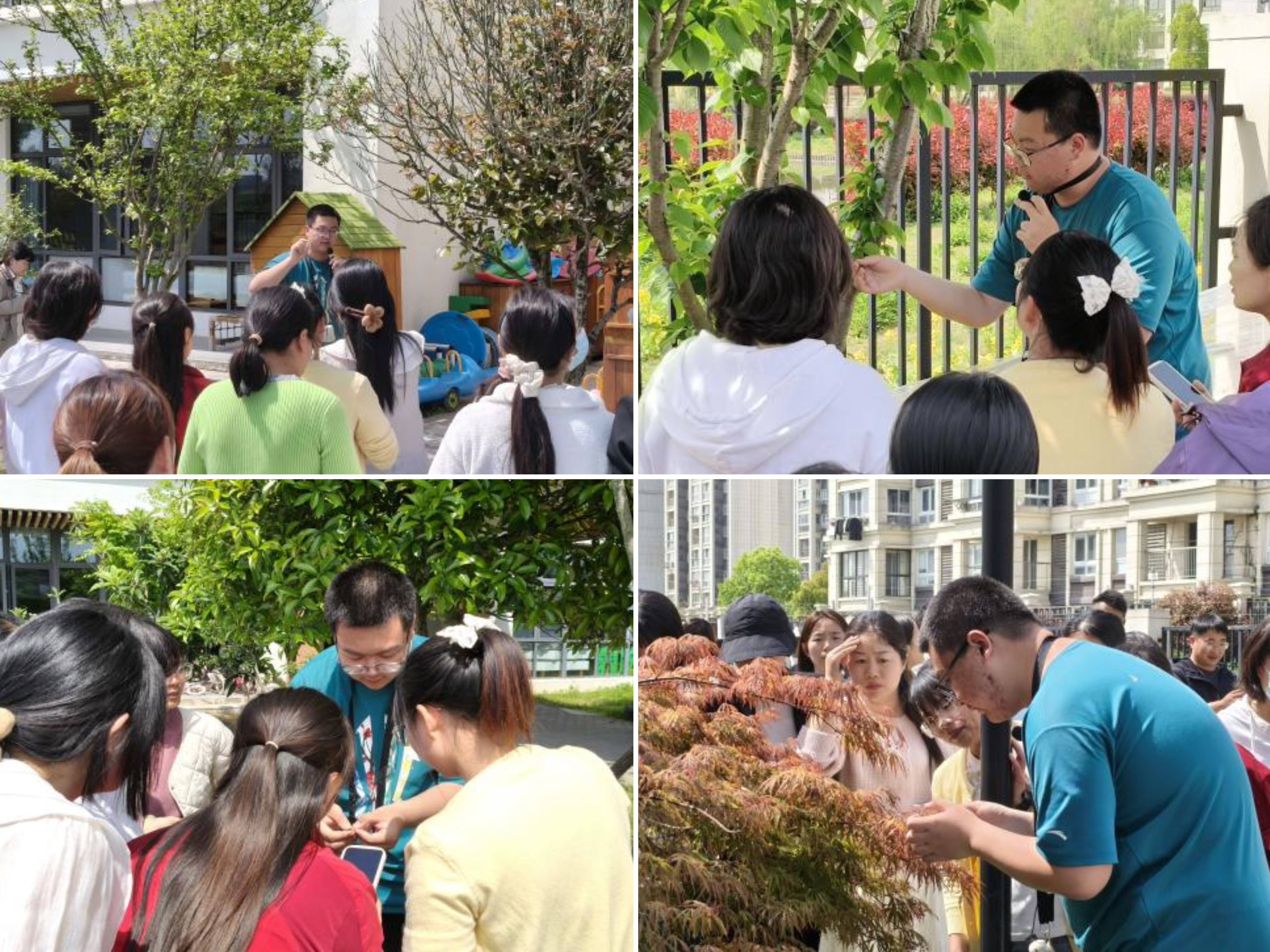 在趣味科普环节,校区学生志愿者结合幼儿园现有植物,围绕槭树、桂花树、樱花树、海棠树等十余种园内树木花草,细致讲解植物外形特点、生长习性及花果特征,普及树木生态作用及基础植物养护知识。