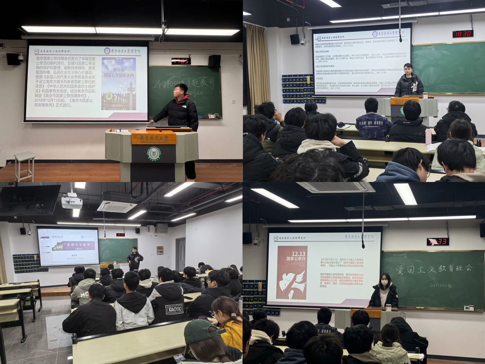 此外,为进一步将爱国主义教育落地、落实,12月14日至16日,理学院在白马校区开展了大学生爱国主义教育主题班会,2024 级信息与计算科学、高分子材料与工程、材料化学3个专业6个班共计176名学生集中学习了《爱国主义教育法》和《南京市国家公祭保障条例》。