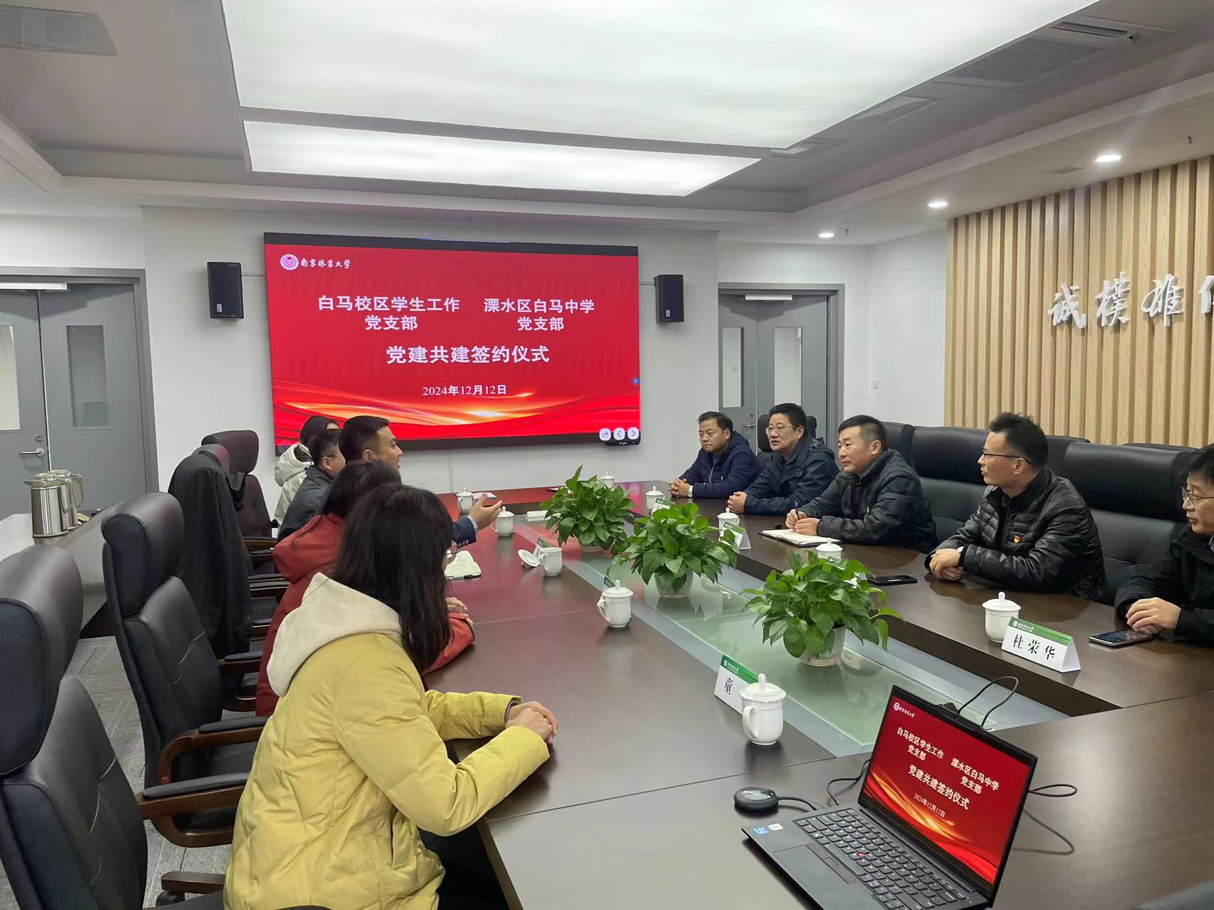 为深化党的教育方针,充分发挥基层党建的核心引领作用,12月12日,白马校区学生工作党支部与溧水区白马中学党支部在校区开展党建共建活动并签署党建共建协议,这标志着双方在党建工作上的深度合作正式拉开。溧水区白马中学校长张忠喜,白马校区党工委副书记、学生工作部部长陈鑫以及白马中学党支部与白马校区学生工作党支部成员参加活动。