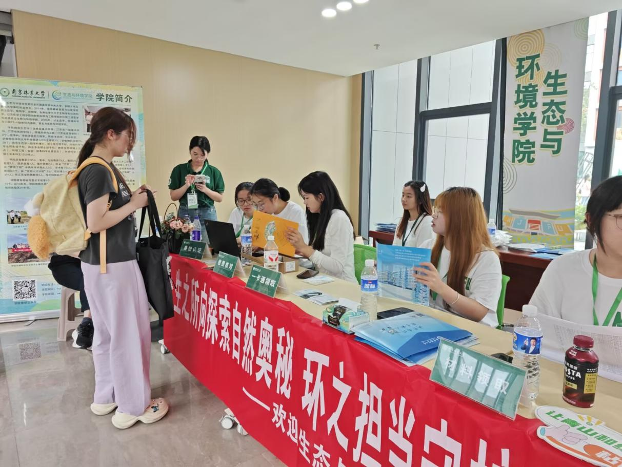 在迎新报到点位,志愿者们以热情饱满的姿态迎接新同学的到来。他们分工明确,耐心指导前来报到的同学依次完成身份认证、缴费核对、一卡通领取和材料发放等流程。为帮助新生更快适应大学生活、深化专业认知、明确发展方向,学院聚焦“成长与生态”两大主题,策划了特色迎新举措,助力每一位新生成长启航。学院系统梳理近三年本科各专业升学数据,制作成《生态与环境学院2025级新生手册》。手册详实呈现升学去向、院校分布与优秀案例,帮助新生从入学之初便建立起清晰的学业发展图景,推动升学教育“早起步、早引导”。学院重点展示由生物多样性与生态保护研究团队倾心编撰的《南京林业大学生物多样性科普图册》。图册聚焦校园内的动植物资源,用生动图文讲述生态故事,让新生在驻足翻阅中感受专业的温度与价值,在潜移默化中厚植生态文明理念,点燃守护绿水青山的初心与使命。