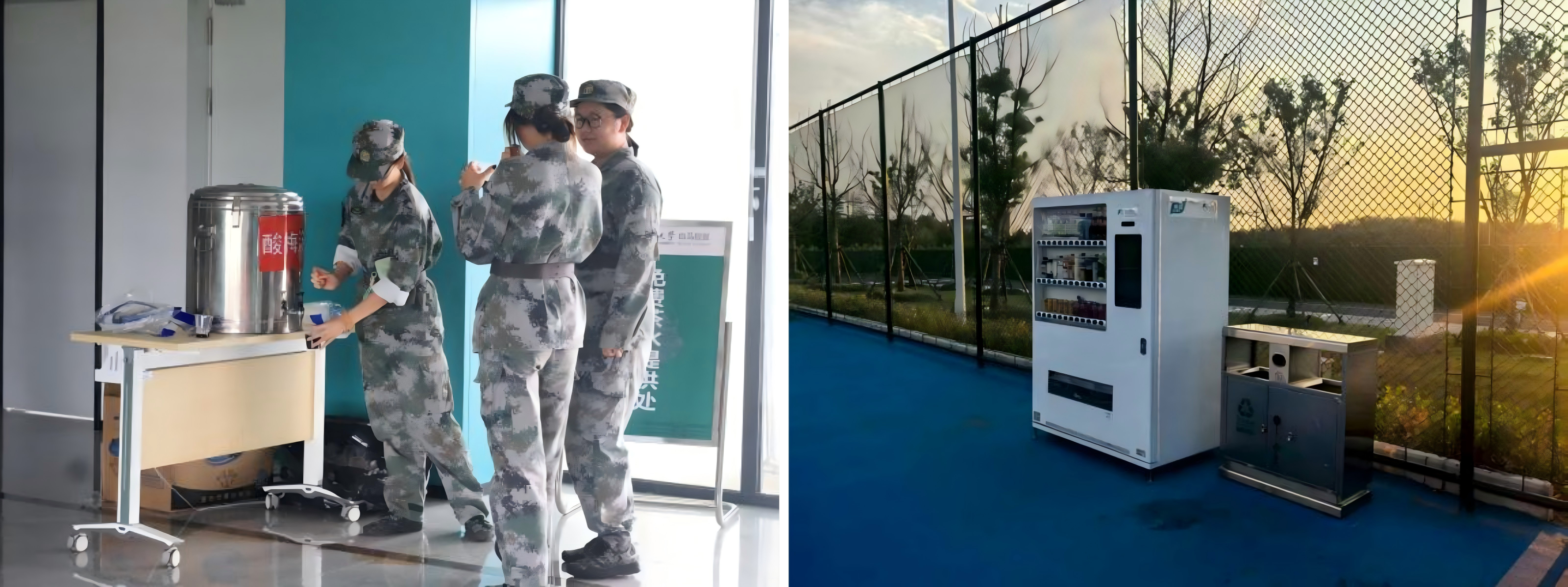 饮食方面,食堂在保证日常三餐营养均衡的基础上,增设盒饭销售点,减少就餐排队,为学生争取更多的休整时间。针对高温天气,紧急调配4000余桶免费纯净水,协调启用自动贩售机,并每日免费提供解暑酸梅汤。细致关怀融入点滴服务,成为学子军训中难忘的温暖记忆。