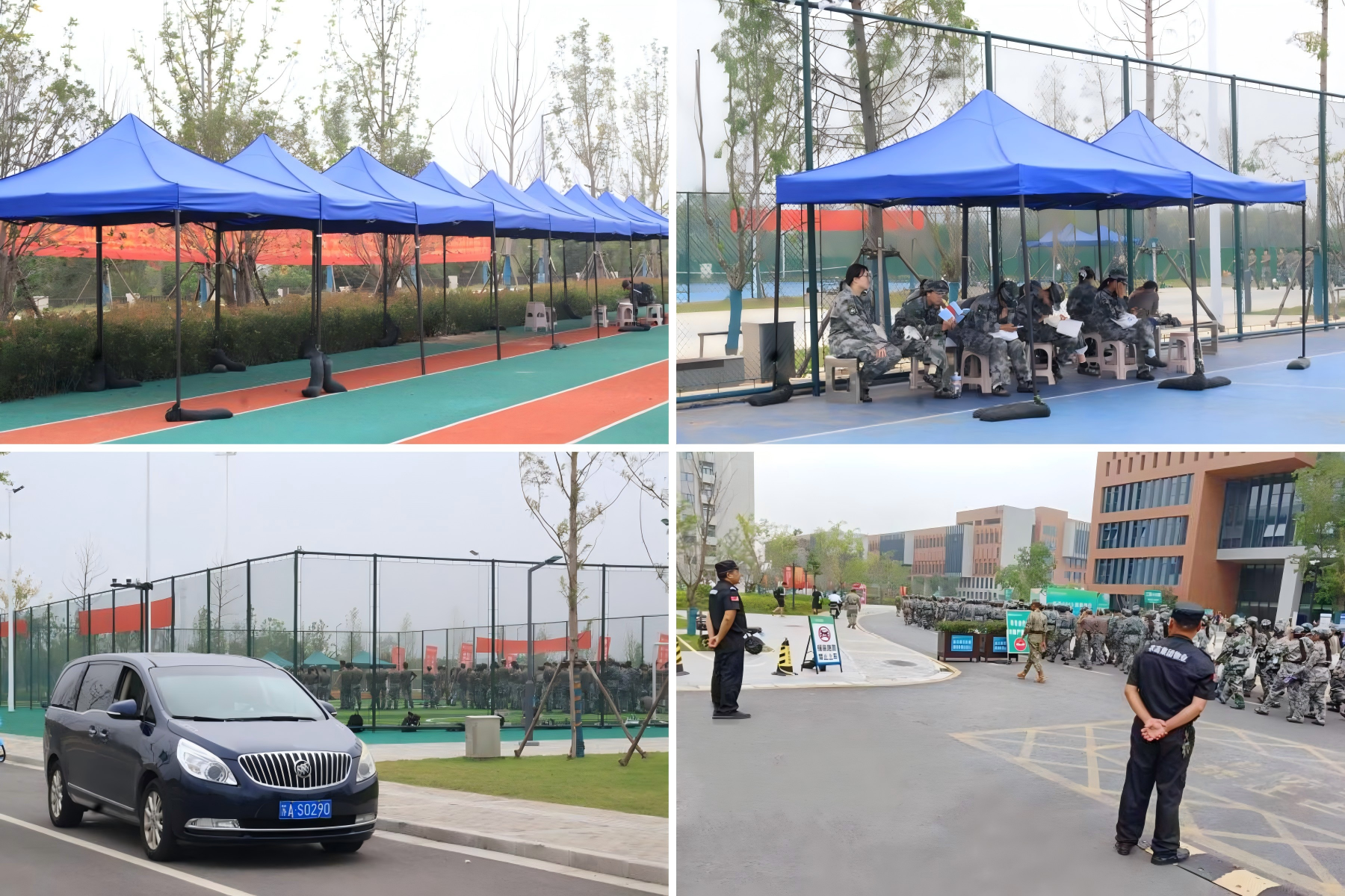 校区科学规划训练场地,充分利用现有场馆,搭设连片遮阳帐篷,配备充足的防暑物资,打造出舒适的"休憩驿站"。交通方面,保障车辆随时待命,安保人员定点执勤,确保训练场与生活区之间的通行安全、高效。