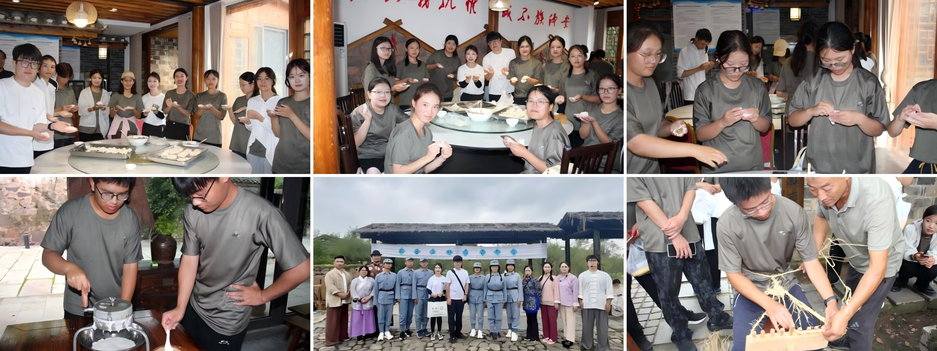 徒步活动结束后,同学们前往李巷民居餐厅参与包饺子活动。大家分工协作,交流互动,在劳动实践中增进情谊,感受节日氛围。午餐后,同学们自由参演抗日小话剧、体验磨豆浆与编草鞋等国庆系列活动,在亲身实践中触摸历史脉搏,进一步丰富了研学内容。风景园林学院吴晓同学在接受采访时表示:“这次活动让我深深感受到了祖国今日繁荣富强的自豪,也切身感受到了革命先烈万里长征的艰辛与坚韧,一颗爱国之心愈发坚定。”